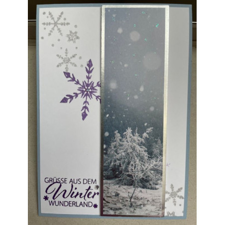 Winterliche Karte mit Glitzereffekt, Winterlandschaft silbern abgesetzt.