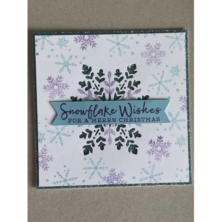 Schneeflocken-Karte mit tollem Glitzerpapier, welches auch den Hintergrund der ausgestanzten grossen Schneeflocke bildet. Mit verzierter Innenseite.