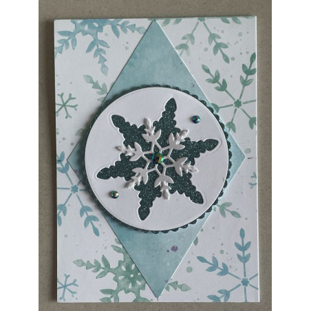 Tolle Karte mit grosser Schneeflocken-Applikation, unterlegt mit funkelndem hellblauem Glitzerpapier. Mit verzierter Innenseite.